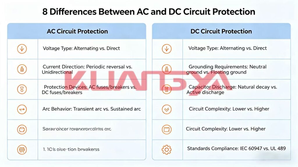 Now that we understand how AC and DC circuit protection work, let’s break down the 8 key differences that every homeowner should know. These differences explain why you can’t mix and match protection devices—and why choosing the right AC vs DC circuit protection is critical for home safety. The chart below summarizes these differences clearly, making it easy to reference when evaluating your home’s electrical system.