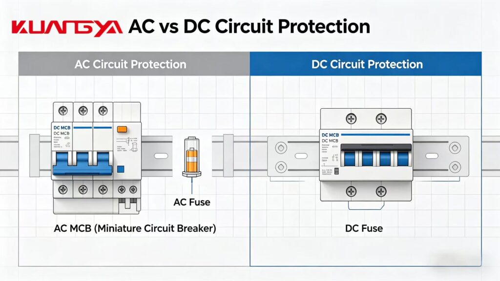 A key point to remember about AC vs DC circuit protection: AC and DC protection devices are not interchangeable. Using an AC breaker on a DC circuit will fail to extinguish the arc, leading to overheating and fire. Using a DC breaker on an AC circuit is overkill (and more expensive) but won’t necessarily be dangerous—though it’s still not recommended, as it may not trip properly for AC-specific faults.