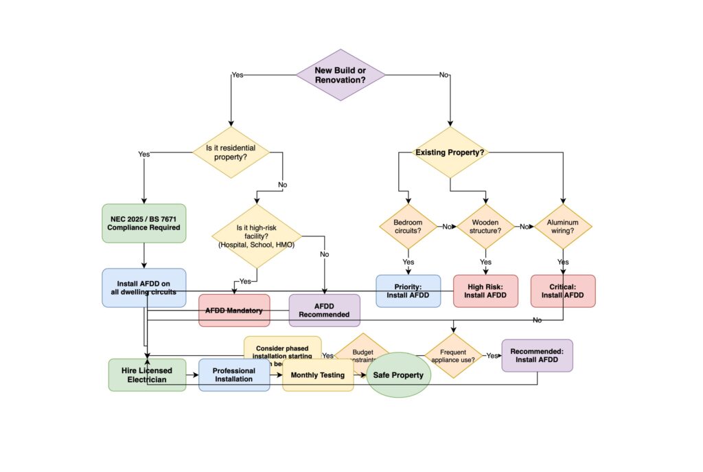 • UK (BS 7671:2018 Amendment 2): The 18th Edition wiring regulations now mandate AFDDs in Higher Risk Residential Buildings (HRRB), homes in multiple occupation (HMOs), student accommodations, and care homes. They are strongly recommended for all other rental and owner-occupied homes.