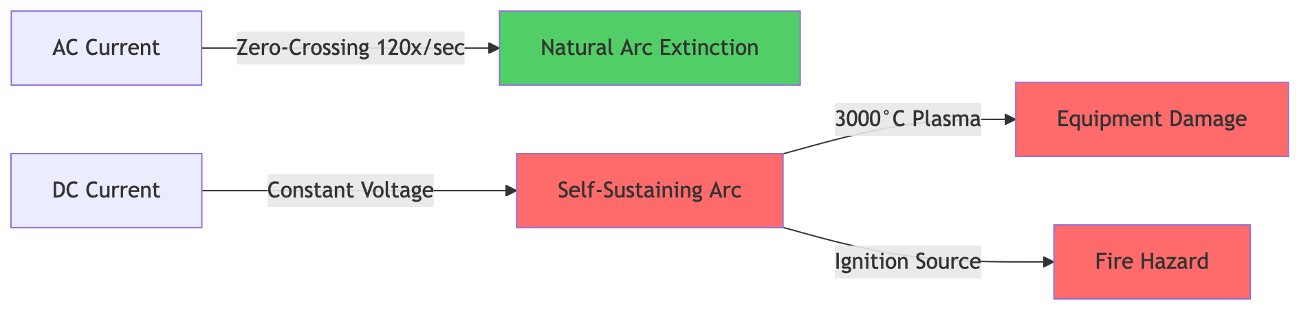 Before comparing solutions, we must understand the unique threat that makes DC protection so critical. The fundamental physics of Direct Current creates a fire hazard that simply doesn’t exist in standard AC electrical systems.