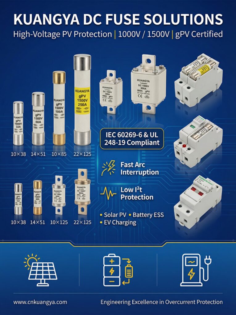 cnkuangya Recommendation: “Never use AC fuses in DC applications, regardless of voltage markings. For any PV system over 600VDC, gPV fuses are mandatory. The 15-25% cost premium for gPV fuses represents 0.03% of total project cost but prevents 85% of DC arc-related failures.”