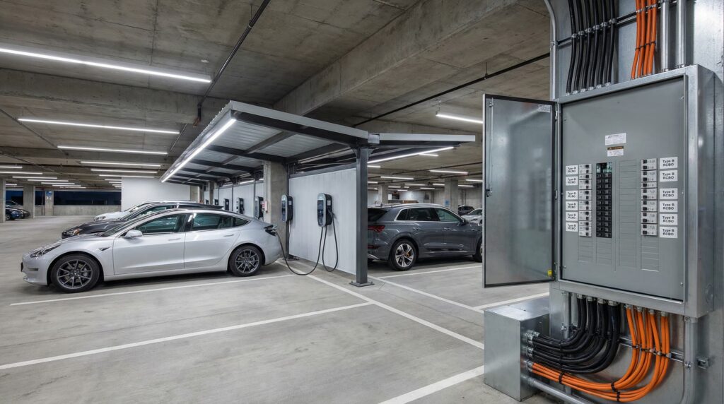 BS 7671 Section 722.531.3.101 provides particularly clear guidance: “Each socket-outlet or connection point for the exclusive use of electric vehicle charging shall be protected by an RCD of Type A, Type F, or Type B having a rated residual operating current not exceeding 30 mA, or by another protective measure providing disconnection of all live conductors.” The specification of Type B as an acceptable option acknowledges that this device category provides comprehensive protection against all forms of residual current that may occur during EV charging.