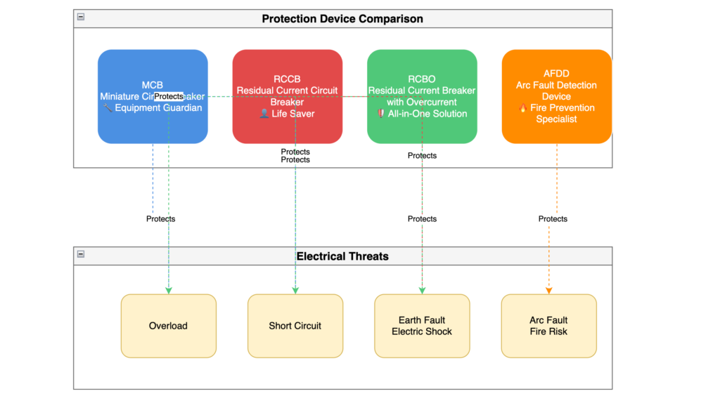 | MCB | Overcurrent Protection | Overload & Short Circuit | General equipment & circuit protection | No protection against electric shock or arc faults. |