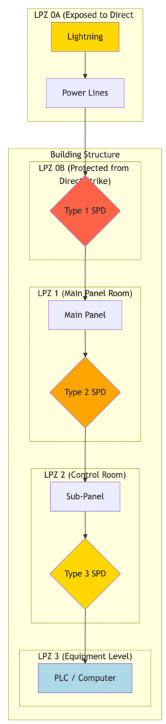 The Lightning Protection Zone (LPZ) concept, showing SPD placement at zone boundaries.