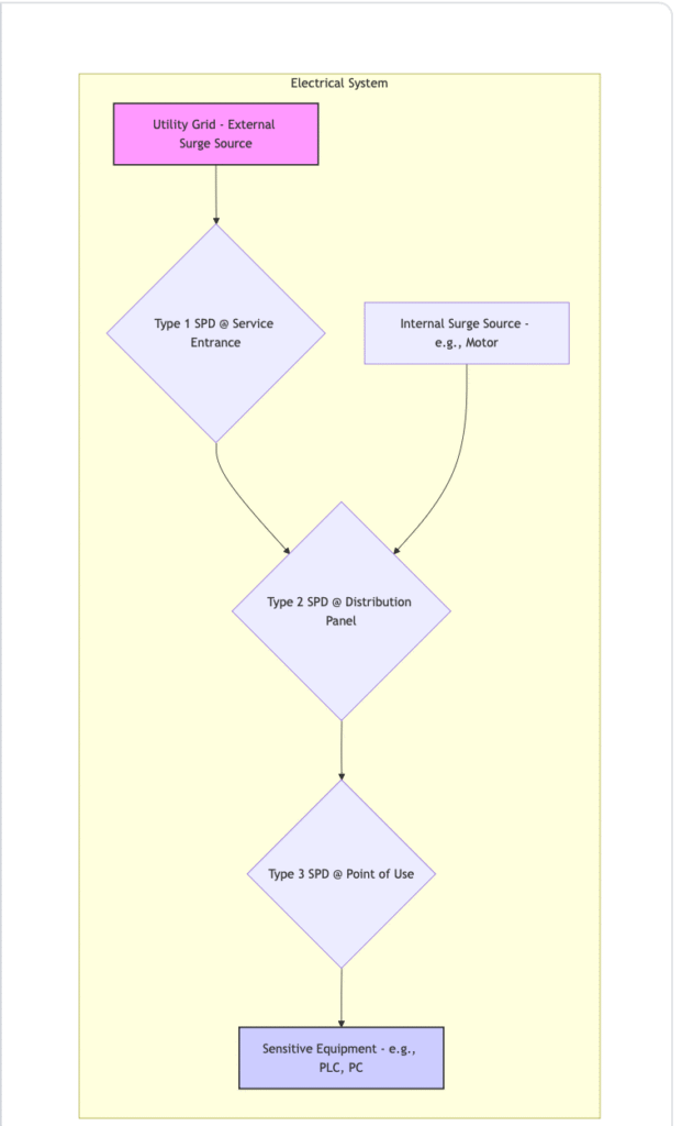 Because these threats come from both outside and inside, a single surge protector is not enough. The most effective strategy is a coordinated, layered approach known as “defense in depth.” Imagine it like a water filtration system: a coarse screen at the intake catches the big rocks, a finer filter downstream catches the sediment, and a final carbon filter at the tap ensures the water is pure. SPDs work in the same cascaded way.SPDs: Not Just One & Done