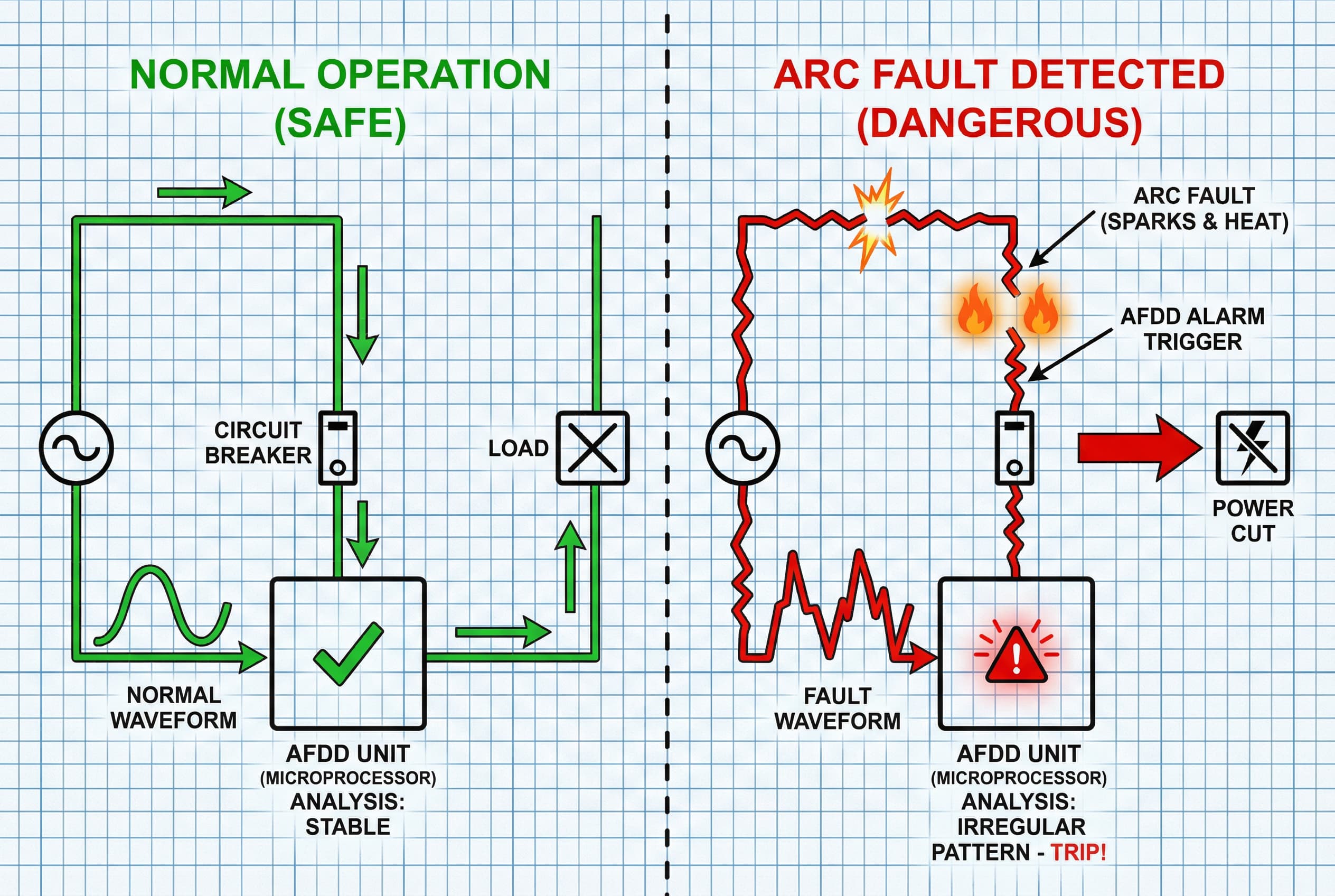 An AFDD uses a microprocessor to analyze the electrical waveform’s “signature.” It is trained to ignore benign arcs (like a light switch turning on) but instantly recognize the high-frequency, erratic patterns of a dangerous arc fault caused by a loose wire or damaged cable—a common precursor to electrical fires.